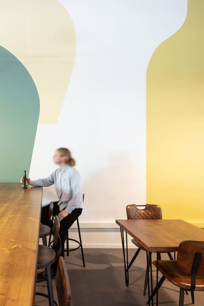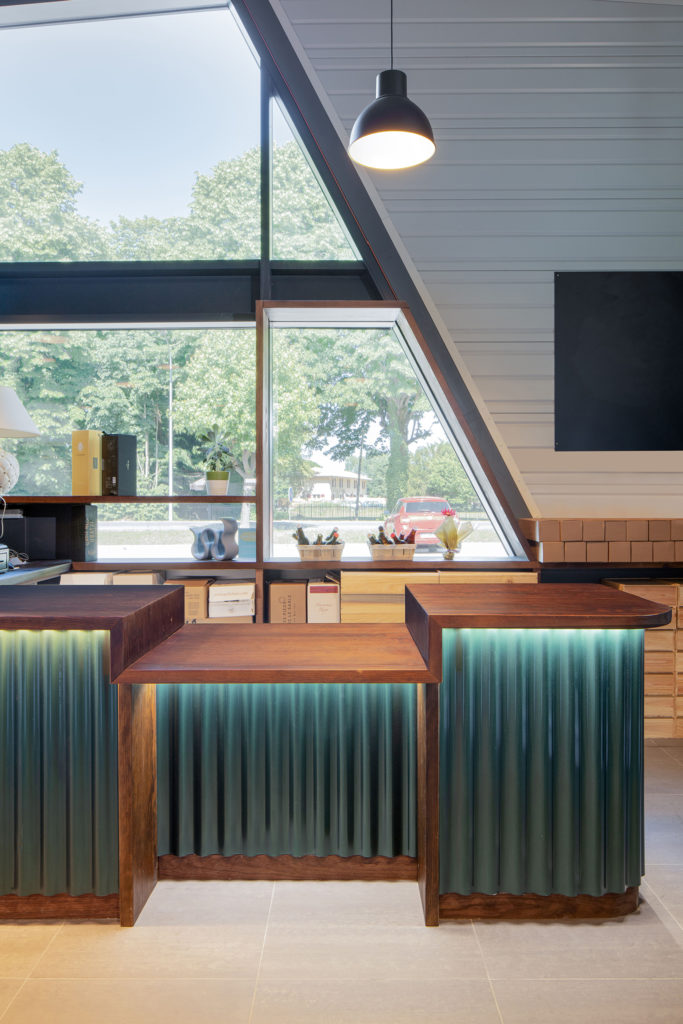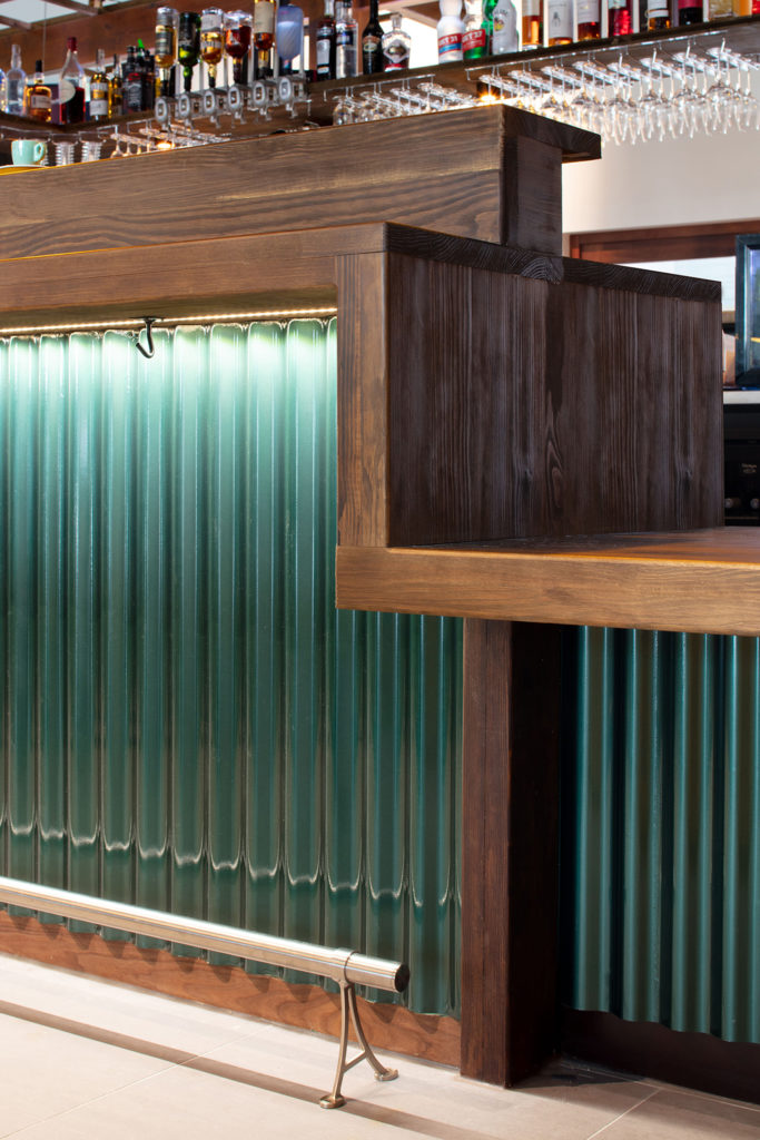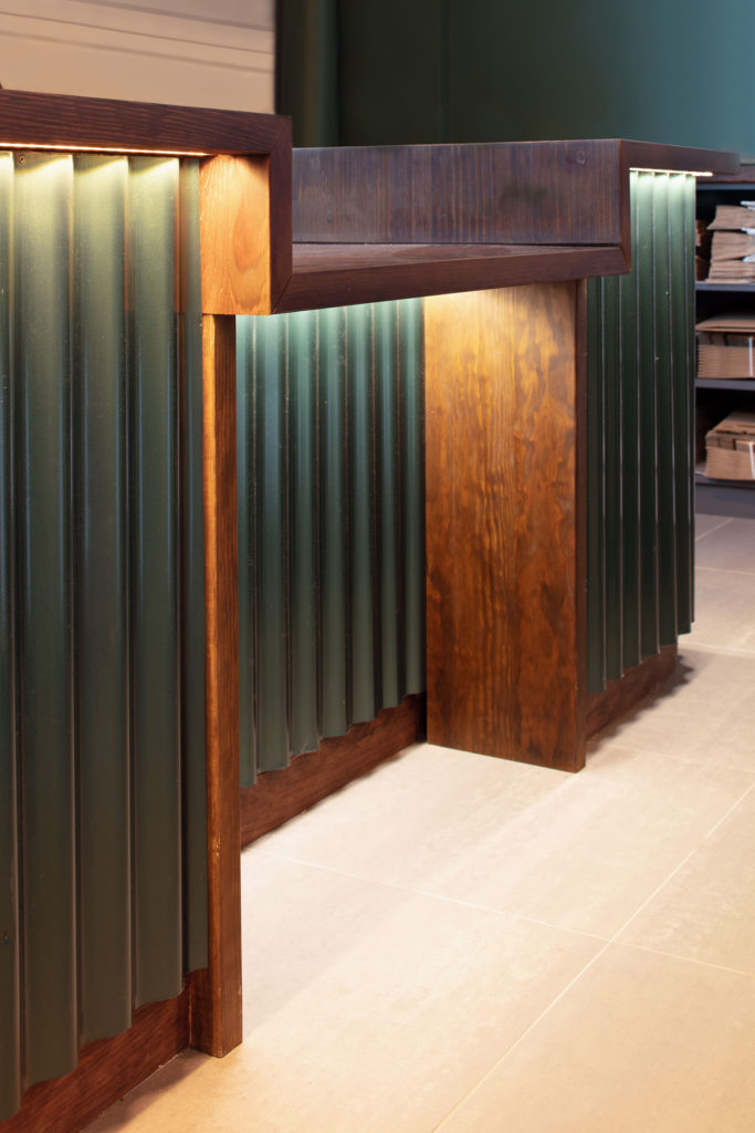 Les trames successives de pin s’interrompent, rejoignent les parois finies en liège intégrant les services, puis apparaissent à nouveau pour abriter le bar. Sa typologie est identique à la banque d’accueil : les plans de travail sont en pin massif lasuré et les finitions en taule verte et brillante. D’apparence plus cossu, il apparaît comme un volume au centre de l’établissement et se retourne pour permettre aux visiteurs de se placer librement dans l’espace en périphérie.