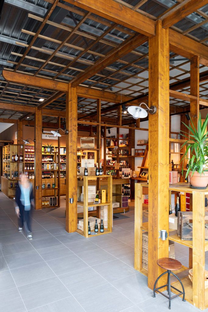 Sur la commune de St-Paul-Les-Dax, l’établissement La Bouteille a vu le jour au début de l’année 2022. Anciennement vide, le hangar est aujourd’hui composé d’une partie cave d’exposition et d’un large bar pour accueillir. La banque d’accueil marque l’entrée, et fait face à l’espace de négoce où sont disposées des palettes & bouteilles. Les aménagements se succèdent en séquences sur le chemin des visiteurs pour ensuite rejoindre une halle en pin massif. Les différents assemblages de bois forment la halle et les meubles, on y découvre les vins & spiritueux.