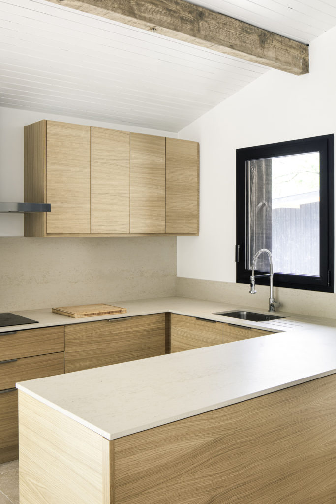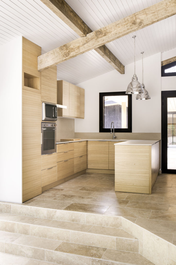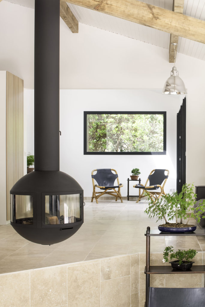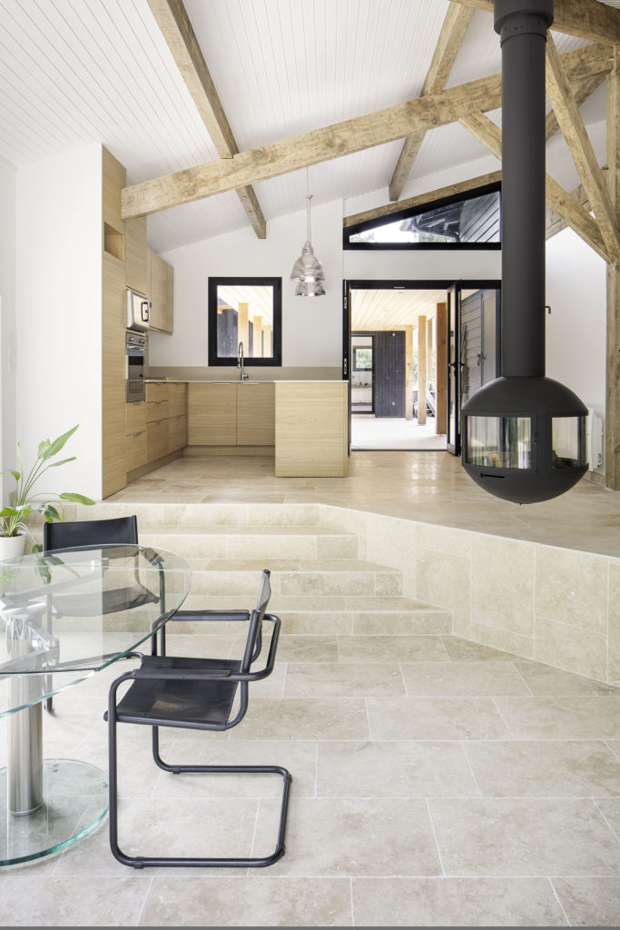 A l’intérieur, la charpente a retrouvé sa teinte brute, et forme un camaïeu d’ocres entre le chêne clair des meubles et la pierre de travertin au sol. L’utilisation de la même pierre au sol à l’intérieur et à l’extérieur avec les terrasses, permet d’avoir une continuité une fois les baies ouvertes, et de créer cette sensation de dedans-dehors. Chaque espace intérieur est ouvert sur le paysage soit par un cadre vertical, soit par de grandes ouvertures coulissantes. Le parcours des volumes intérieurs est libre et s’effectue par des changements de niveaux qui organisent les pièces à vivre. De grandes salles ouvertes contrastent avec les aménagements de plus petits salons à s’approprier pour s’isoler. La cuisine se retourne à l’entrée et mène la table de réception des convives par un jeu d’escalier autour du poêle à bois central.