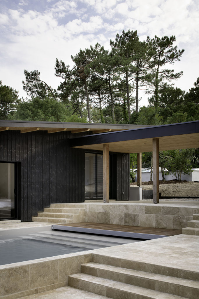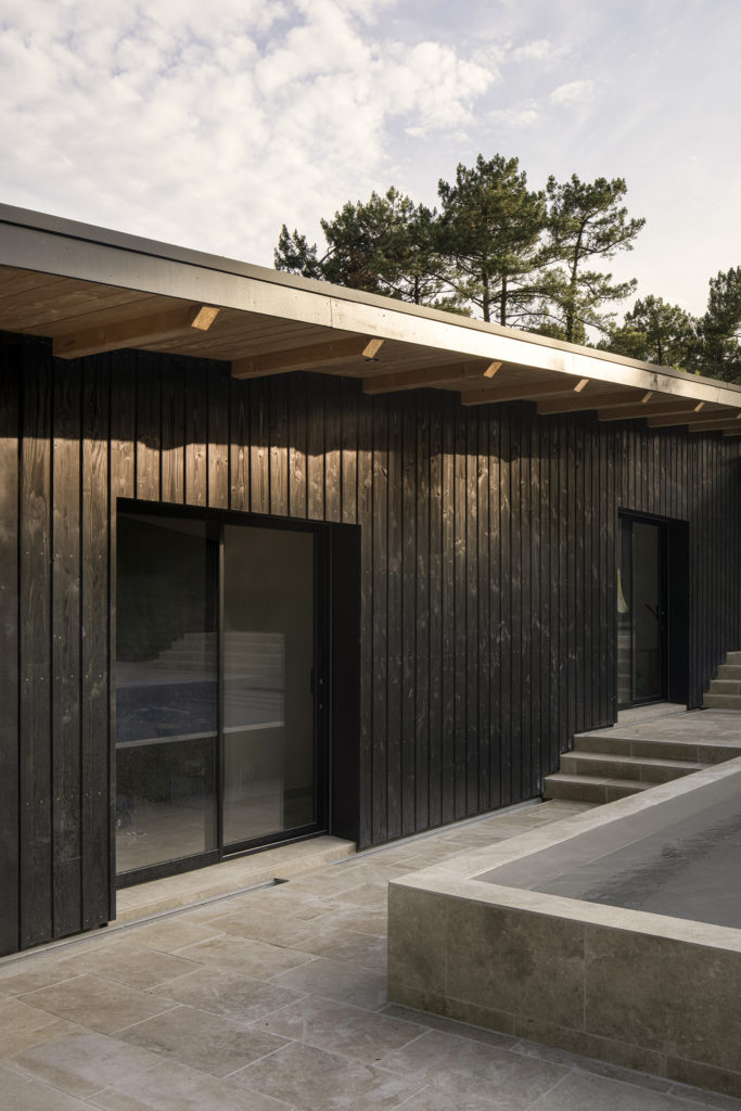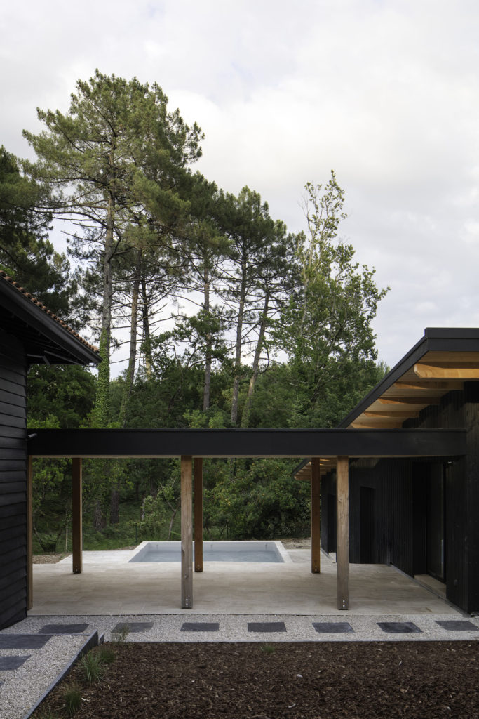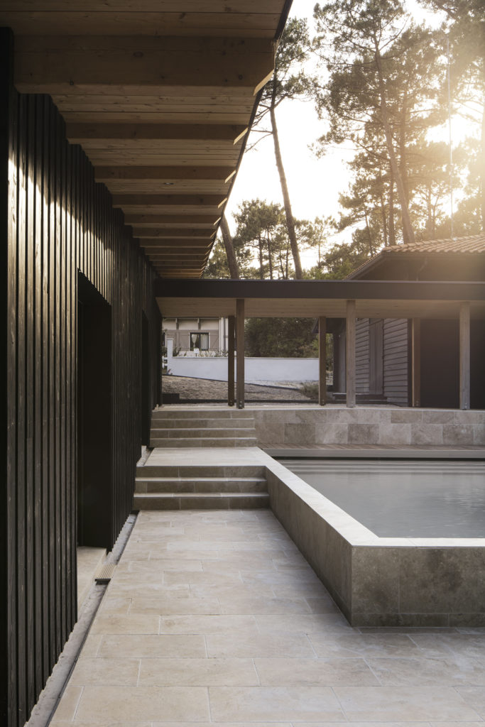 A un kilomètre de la côte, la pinède surplombe déjà certains quartiers proche de la dune. Les habitants de la maison vivent entourés par les pins, chênes lièges, arbousiers, fougères et bruyères qui composent la forêt. La maison et la nouvelle annexe sont implantées à fleur du terrain en pente. Les deux volumes bâtis sont en ossature bois, séparés par la piscine en longueur et composés de différents niveaux de terrasses en pierre, évoquant un lieu thermal au milieu d’arbres. Le porche d’accueil couvre l’espace entre la nouvelle annexe et la maison rénovée. Il relie l’ensemble par une séquence de poteaux intégrés sous une sous-face en sapin de la couleur brut du bois. Le reste des bardages et menuiseries de la maison Pinaster sont de couleur noire, comme les troncs mouillés des pins maritimes. Les volumes de l’habitation disparaissent alors derrière les troncs et feuillages environnants.