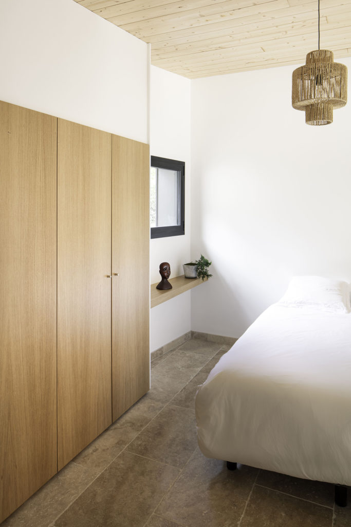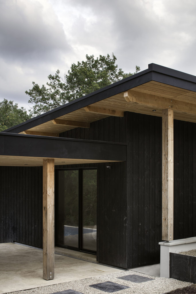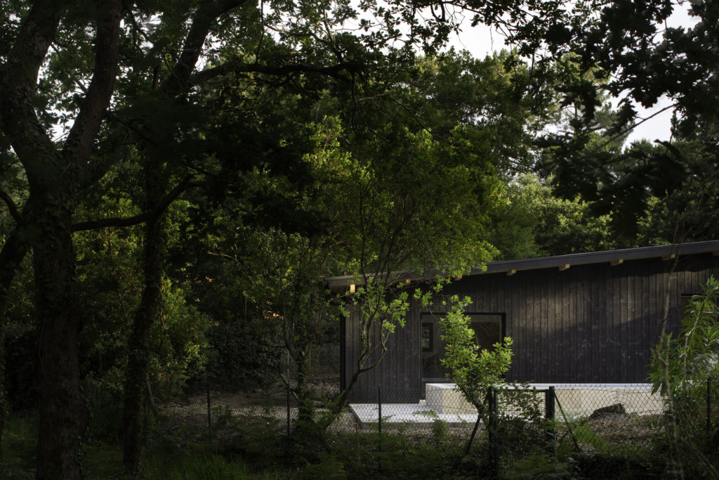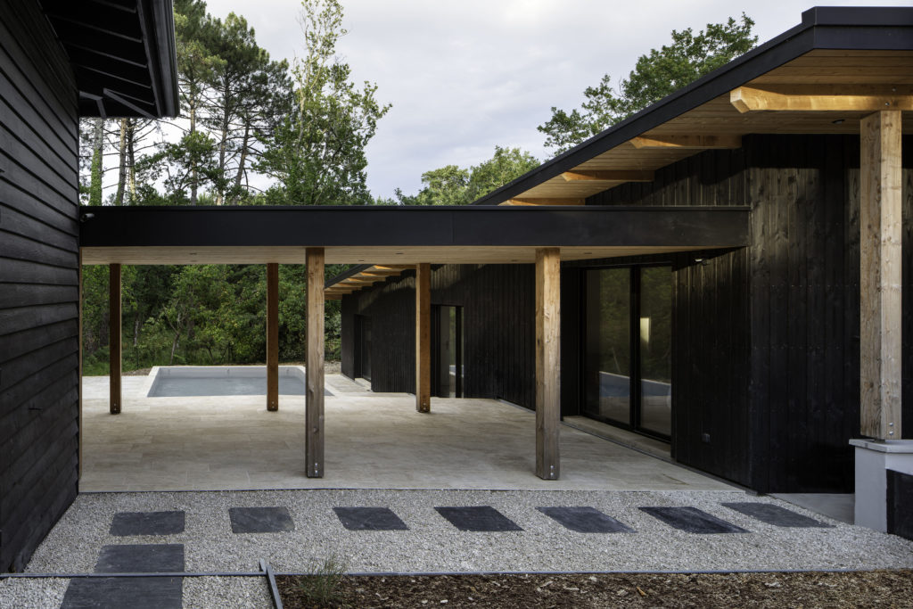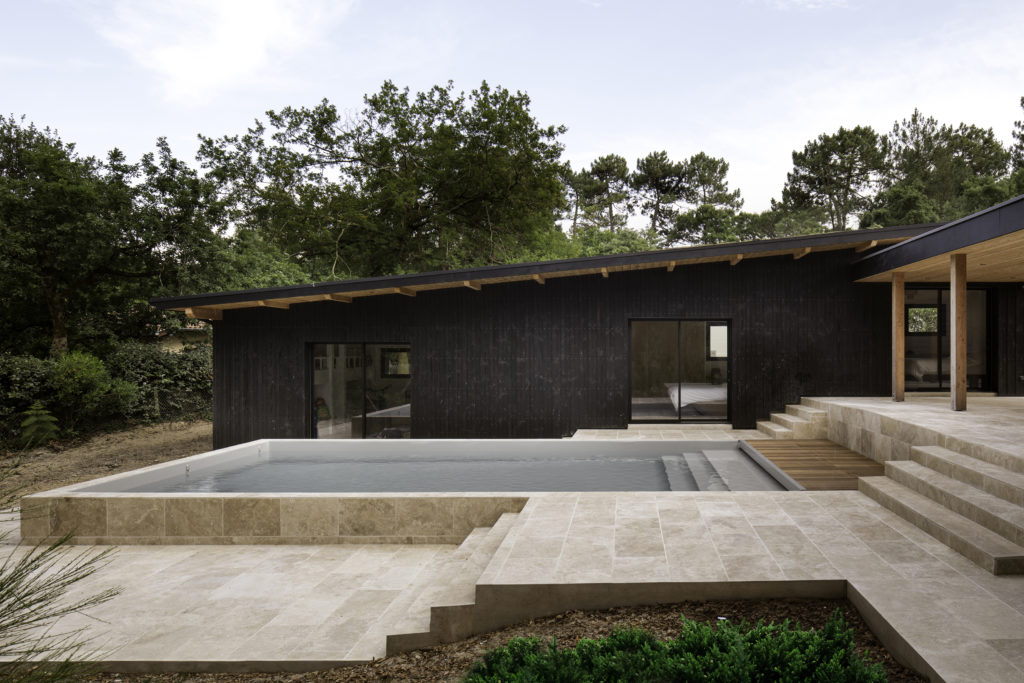 A un kilomètre de la côte, la pinède surplombe déjà certains quartiers proche de la dune. Les habitants de la maison vivent entourés par les pins, chênes lièges, arbousiers, fougères et bruyères qui composent la forêt. La maison et la nouvelle annexe sont implantées à fleur du terrain en pente. Les deux volumes bâtis sont en ossature bois, séparés par la piscine en longueur et composés de différents niveaux de terrasses en pierre, évoquant un lieu thermal au milieu d’arbres. Le porche d’accueil couvre l’espace entre la nouvelle annexe et la maison rénovée. Il relie l’ensemble par une séquence de poteaux intégrés sous une sous-face en sapin de la couleur brut du bois. Le reste des bardages et menuiseries de la maison Pinaster sont de couleur noire, comme les troncs mouillés des pins maritimes. Les volumes de l’habitation disparaissent alors derrière les troncs et feuillages environnants.