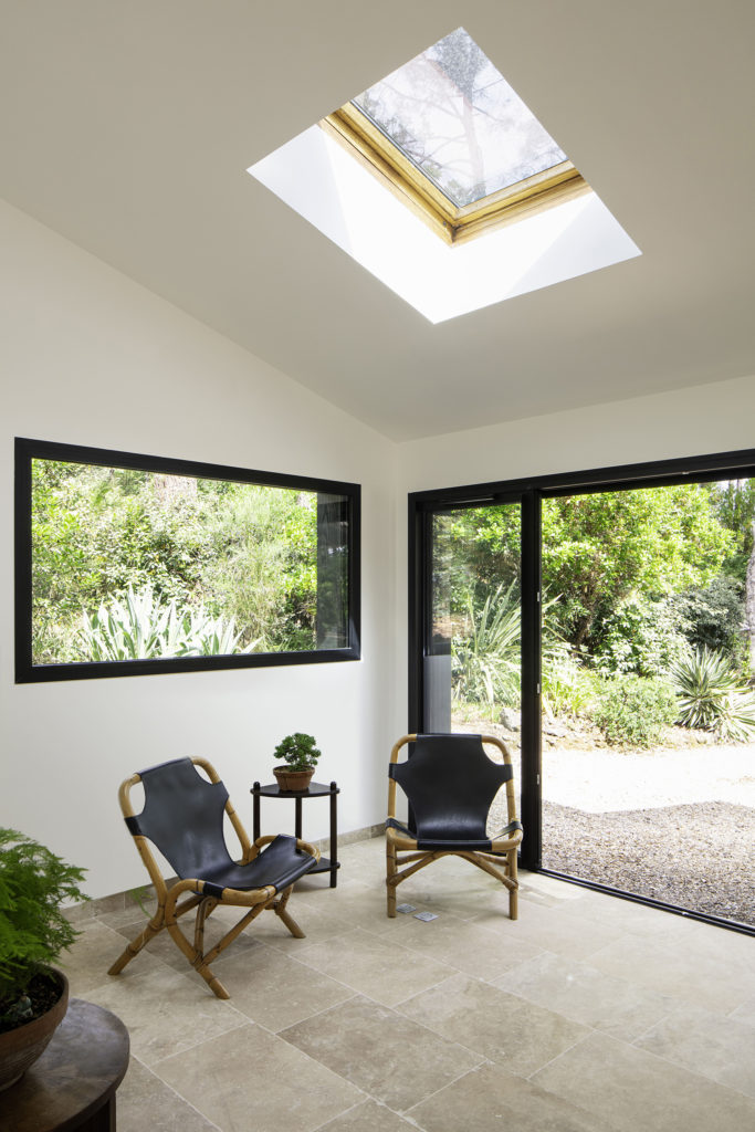Chaque pièce jouit d’une grande lumière naturelle et de la vue sur le jardin .Le rez-de-chaussée en contrebas s’enroule autour d’une large terrasse composé des assises et de la piscine. Au même niveau, une grande pièce de vie se déploie en longueur, et termine avec une grand baie fixe, un cadre sur le jardin pour y observer changer les saisons. La toiture inversée souligne la perspective de ces espaces et s’avance largement pour les couvrir du soleil d’été. Elle est soutenue par un jeu de poteaux donnant leur envol à la toiture.